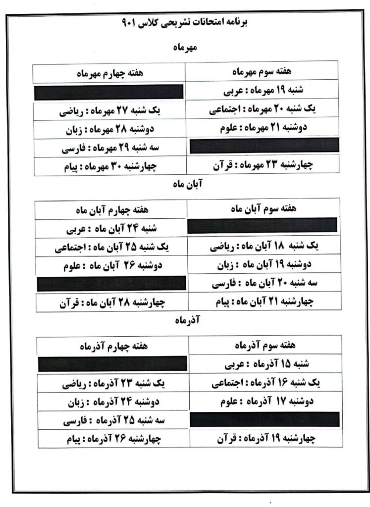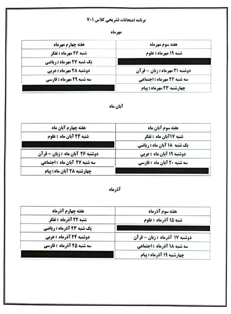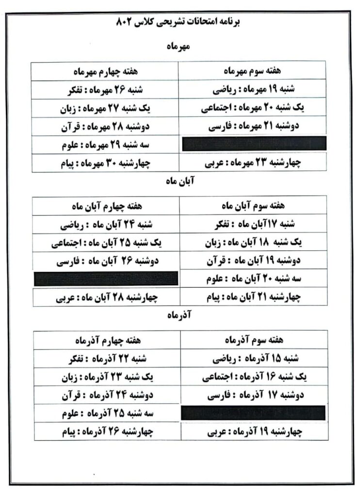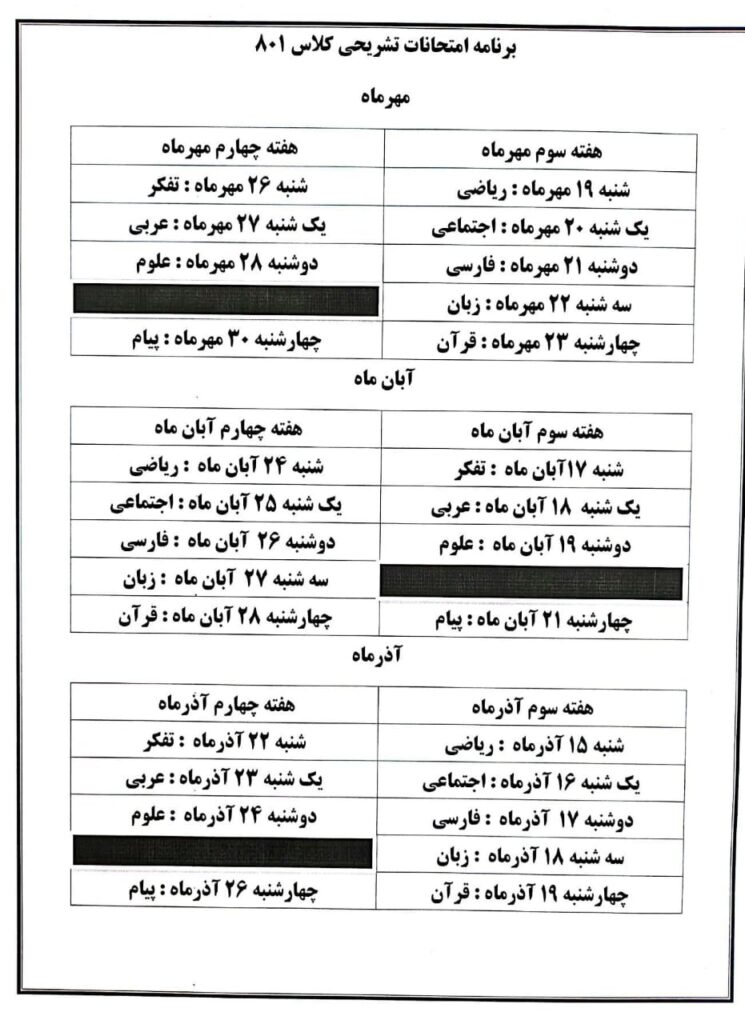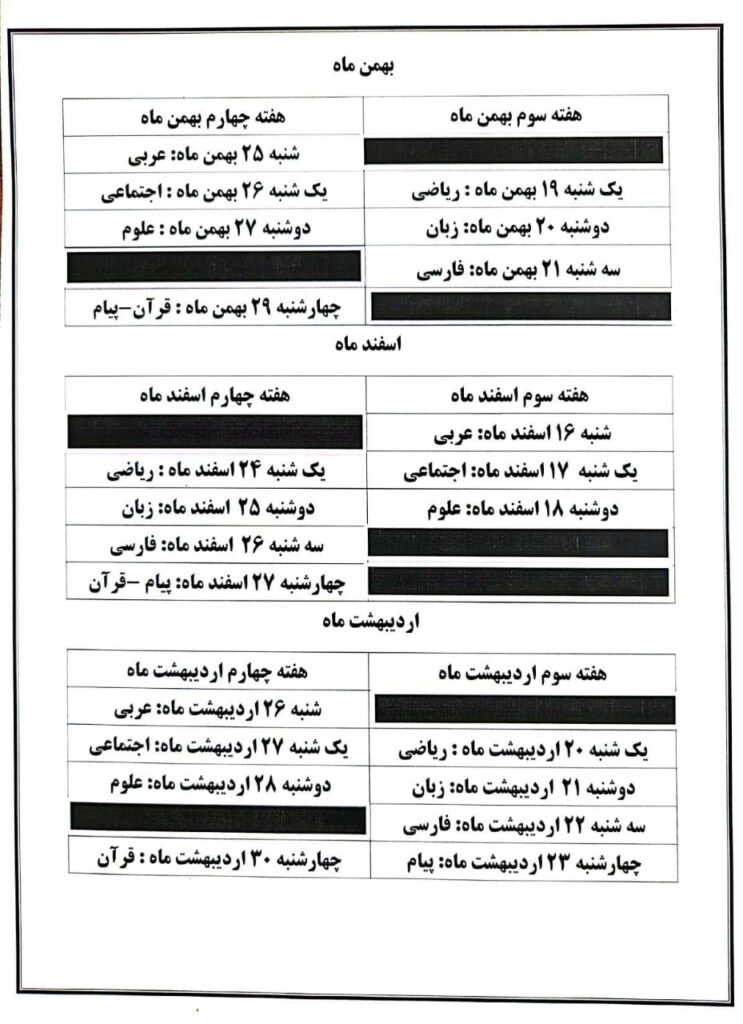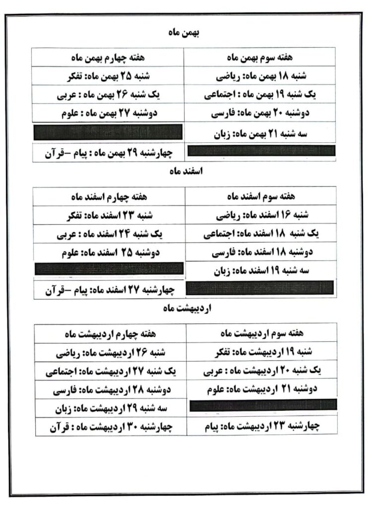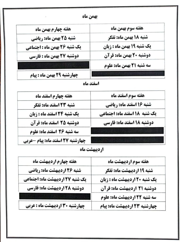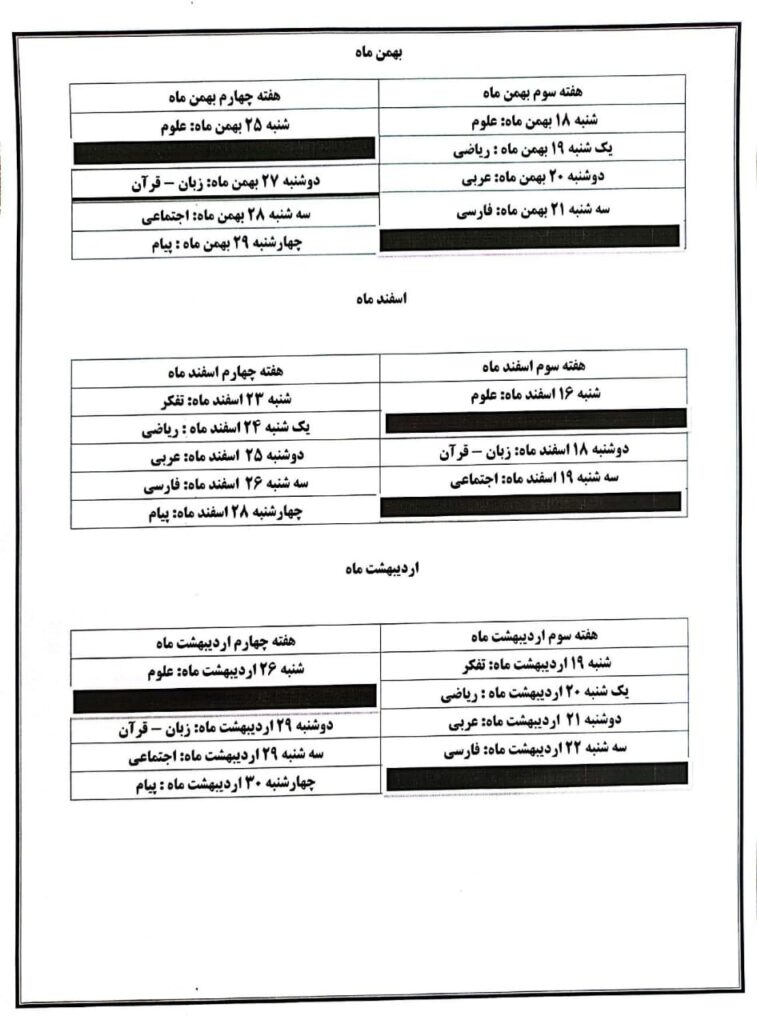 دانشآموزان گرامی، برنامهی آزمونهای تشریحی ماهانه هر پایه در ادامه قابل مشاهده است.
